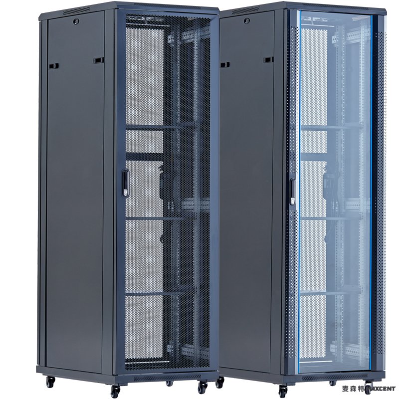 麥森特(maxcent)品牌網絡機柜常見顏色有白色、黑色。 鋼化玻璃門和網格門的區別。